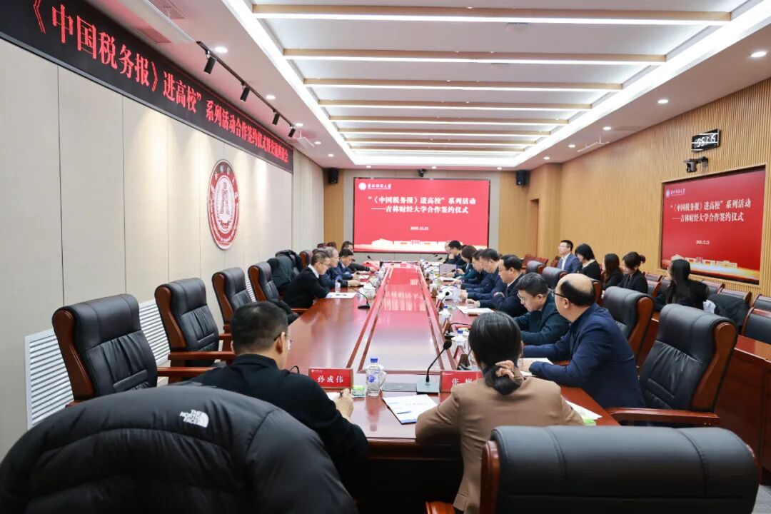 《中国税务报》记者部、内参部主要负责人张剀,吉林省税务局办公室副主任宋磊,学校相关职能部门负责人参加了签约仪式。