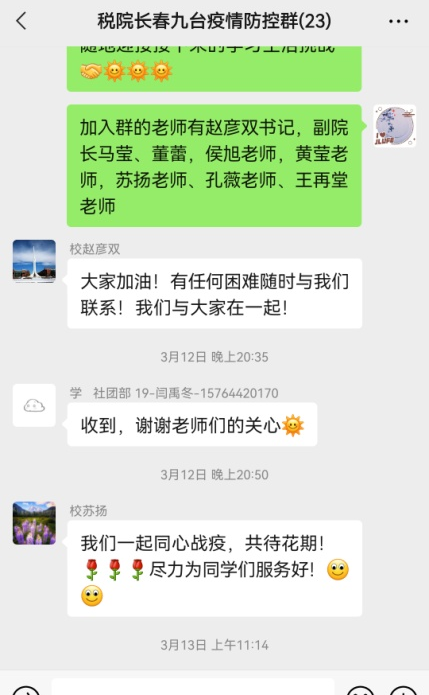 为确保学院返校师生的身心健康,做好思想引导和关心关爱工作,学院党委响应学校党委号召,周密制定工作方案,建立“书记院长——支部书记、辅导员——党员、教师”为架构的包保体制,全院教师积极响应学院党委号召,按照本科生导师制任务分工情况,形成对在校学生全覆盖、全时段、全方位的关心关爱。通过微信、电话、网络等形式,开展线上的防疫知识宣讲和心理健康疏导。学院全体党委委员带头,与42名健康监测学生建立“一对一”“一对多”联系包保,做到同心战疫见真情,守望相助送温暖。