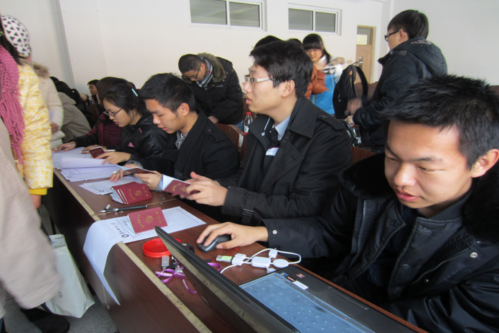 在学生报到注册工作中,各班班委进行辅助工作,收取同学们的学生证进行集中注册,这样就简化了同学们的注册步骤,为同学们提供了便利。未能及时到校注册的同学,也可以在到校后进行注册,不必担心延迟而无法注册。虽然很繁忙,但注册工作一直在有条不紊地进行。下午3点,注册工作逐渐接近尾声。