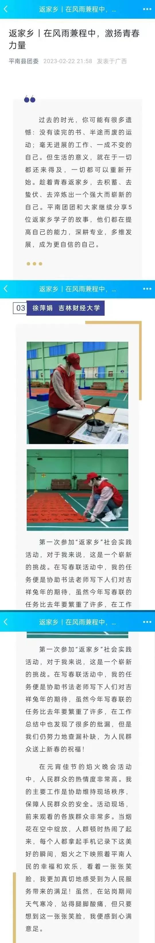 “返家乡”社会实践活动是践行社会主义核心价值观的有效途径,是大学生磨练品格、增长才干、实现全面发展的重要舞台。通过社会实践税院学生切身感受了党的领导下过去五年和新时代十年取得的宏伟成就,在服务家乡、服务人民中学思践悟习近平新时代中国特色社会主义思想的世界观、方法论和党的二十大精神,用实际行动在以中国式现代化全面推进中华民族伟大复兴的使命任务中贡献自己的青春力量。祝愿税院学子能在“返家乡”社会实践活动中开阔视野,提升思想,共话青春,将理论转化为能力,将热爱转化为行动,立志做有理想、敢担当、能吃苦、肯奋斗的新时代好青年,让青春在全面建设社会主义现代化国家的火热实践中绽放绚丽之花。
