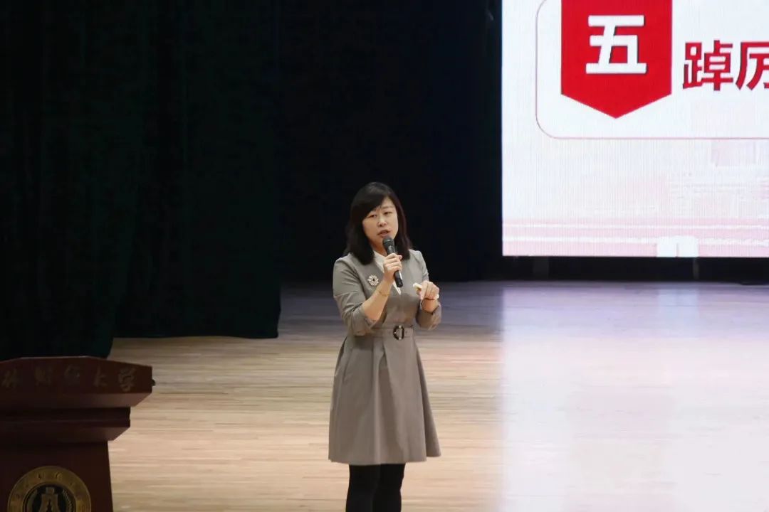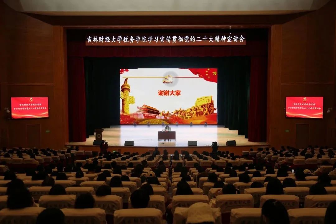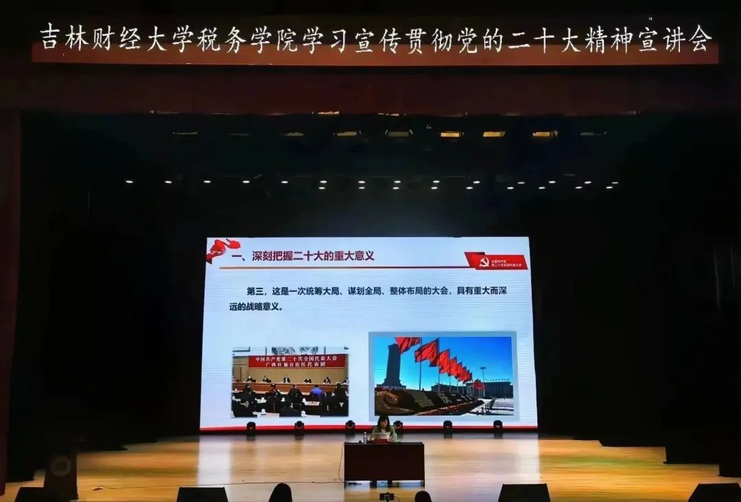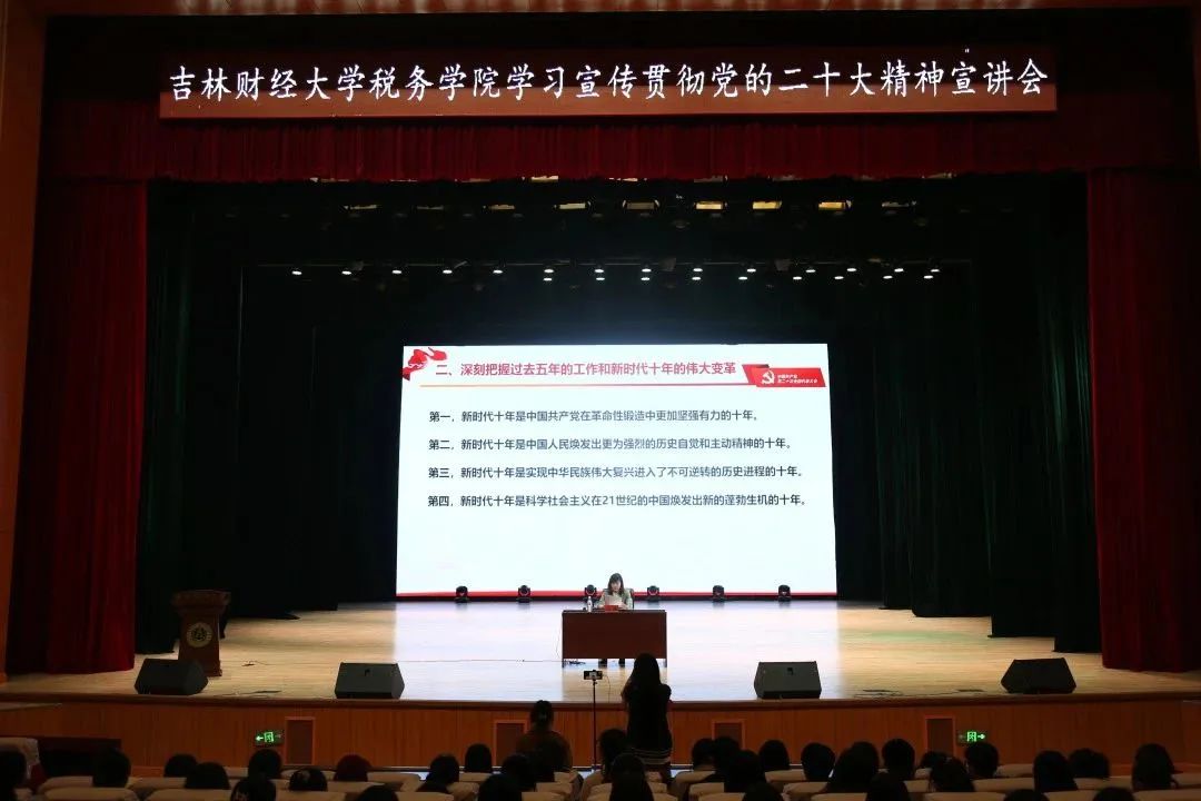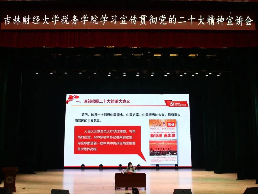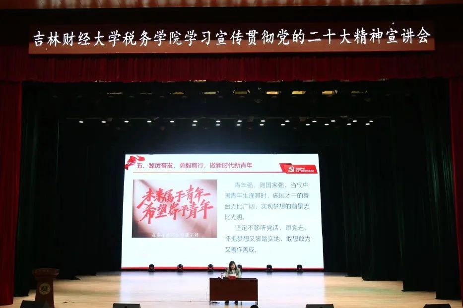 宣讲会上吕敏老师首先讲到党的二十大是我们党的历史上具有重要意义的一次会议,是一次统一思想、统一意志、统一行为的大会,具有重大而深远的战略意义。吕敏老师紧扣党的二十大报告原文,将中国共产党过去五年的工作和新时代十年的伟大变革以及以中国式现代化全面推进中华民族伟大复兴的具体实现路径进行了系统概括。其次,吕敏老师结合吉林省省情总结阐述了近些年来吉林发展所取得的丰硕成果,重点谈到坚定推动党的二十大决策部署在吉林落地生根。最后,吕敏老师强调当代青年是与新时代同向同行、共同前进的一代,未来的中国青年,必将“以青春之我,创建青春之国家,青春之民族”。大胆创新,拼搏向上,担负起时代重任,在实现中华民族伟大复兴的伟大实践中放飞梦想。