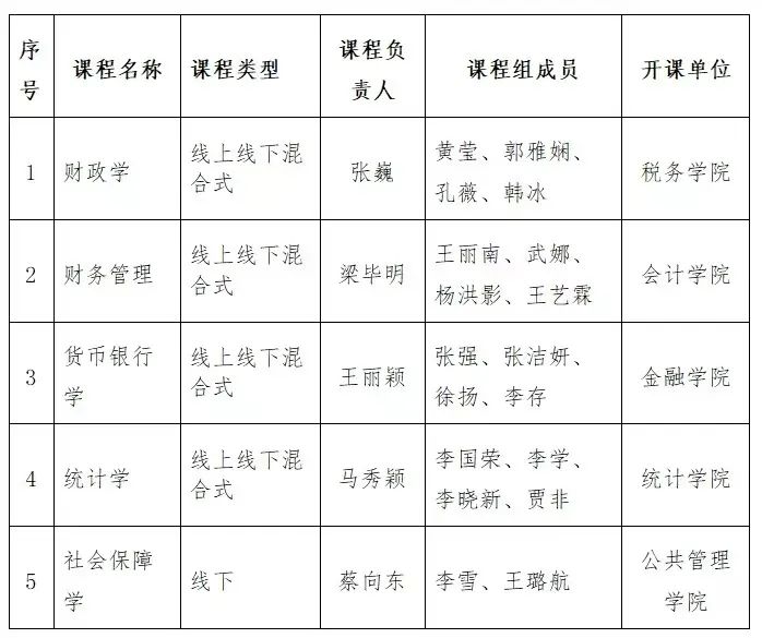 近日,教育部公布了第二批国家级一流本科课程的认定结果,认定5750门课程为第二批国家级一流本科课程,其中线上课程1095门,虚拟仿真实验教学课程472门,线下课程2076门,线上线下混合式课程1800门,社会实践课程307门。本批次我校有5门课程被认定为国家级一流本科课程,其中财政学、财务管理、货币银行学、统计学4门课程被认定为线上线下混合式国家级一流本科课程,社会保障学课程被认定为线下国家级一流本科课程。至此,我校共有7门课程被认定为国家级一流本科课程,这是我校深入实施“育人立校”战略工程取得的又一重要新成果。