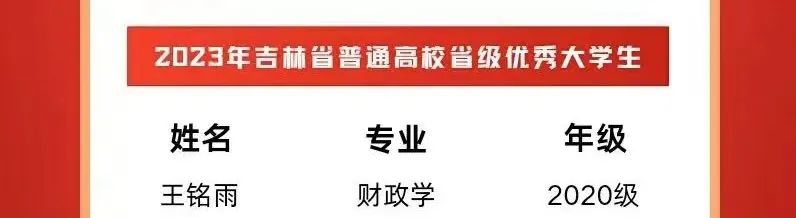 近日,2023年吉林省“优秀大学生”寻访活动评审结果揭晓,经学校评选推荐,省推荐选树工作领导小组审核、公示,吉林省教育厅确定,我院2020级财政学专业学生王铭雨同学荣获2023年吉林省普通高校省级“优秀大学生”荣誉称号。
