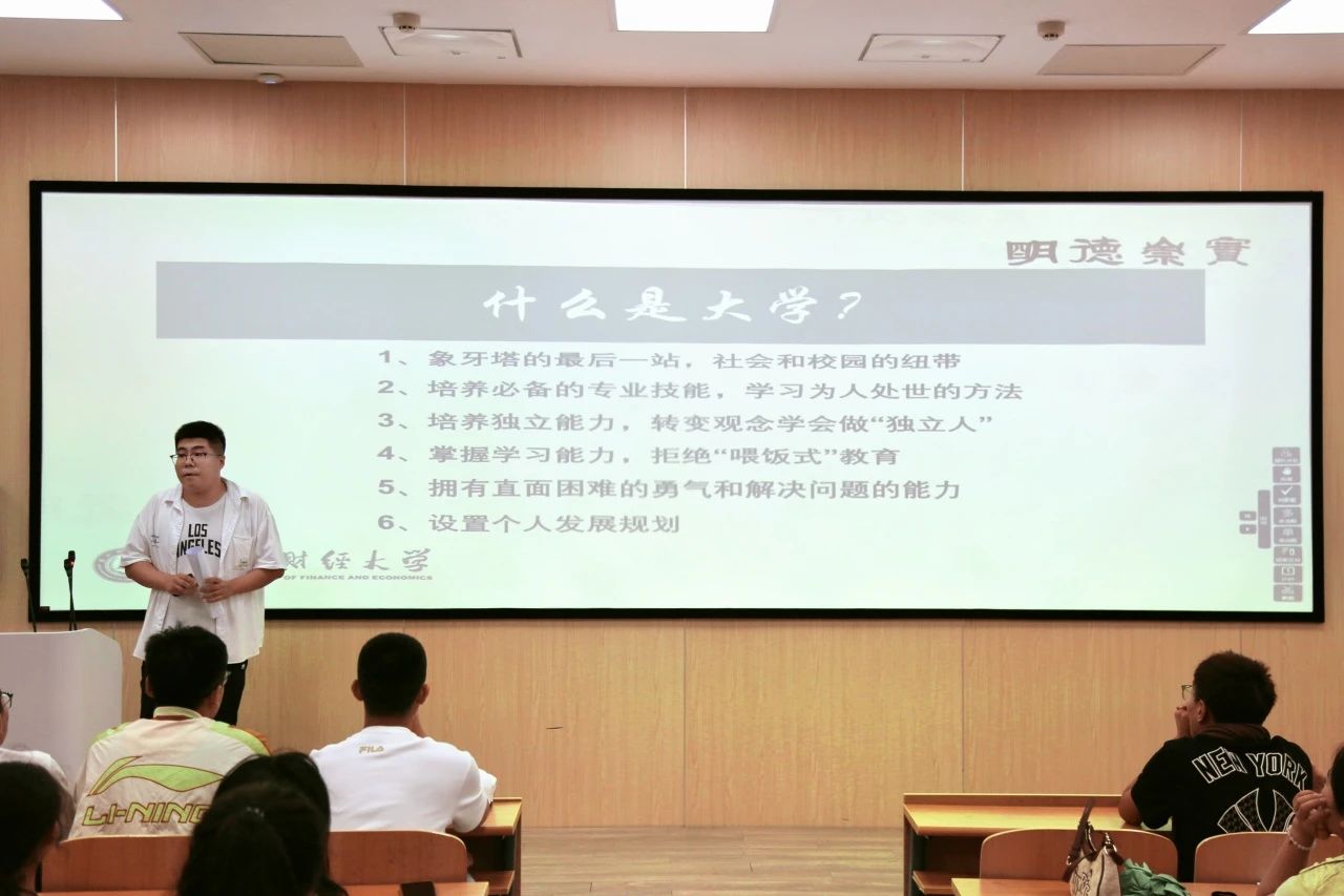 王家赫老师首先和大家介绍了他本人以及各位班导们的一些基本情况,并详细解读了辅导员的主要工作职责,用幽默风趣的语气很快的拉近了辅导员和同学们之间的距离。同时希望可以和大家在未来四年的时间里和谐、愉快地相处,互相学习、共同进步。与此同时王老师也向同学们讲解了各个班级名字和班号的由来,让大家了解到整个年级和各个班级的人员构成情况,也希望同学们能正确地表述自己的专业和班级。随后他向新生介绍了教师办公地点、304永利集团团委老师团队构成等基本情况,希望大家能够对税院有更深入的了解,尽快融入到304永利集团的大家庭中。