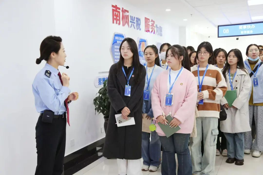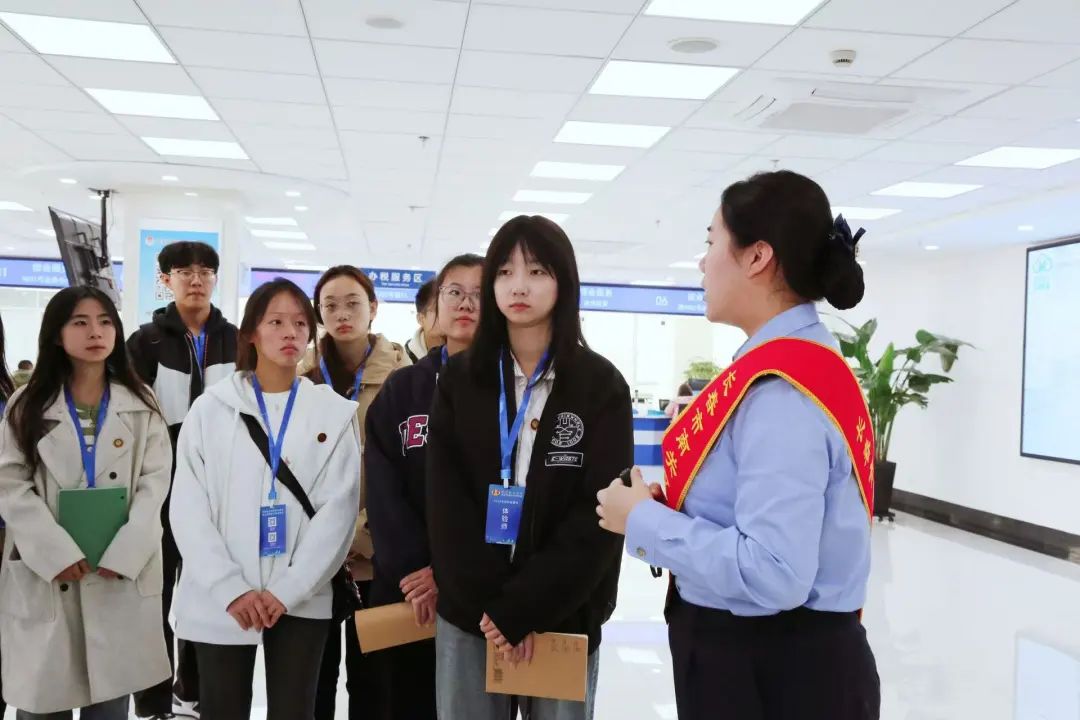 在南关区税务局办税服务厅,学生们依次参观了自助办税区、税费争议调解区、电子税务局体验区、简事快办区、社保费专区,了解体验税务部门的职业特点、工作流程、操作规范,观察税务工作人员如何以熟练的技能和高效的流程为纳税人办理业务。在一体化自助办税区,学生们“沉浸式”体验智慧办税终端,亲身感受了自助办税的便捷化、智能化,切实为南关区税务局大力优化服务和营商环境,为人民群众解难题、办实事的敬业精神所感动。
