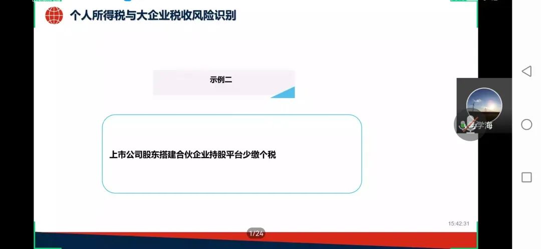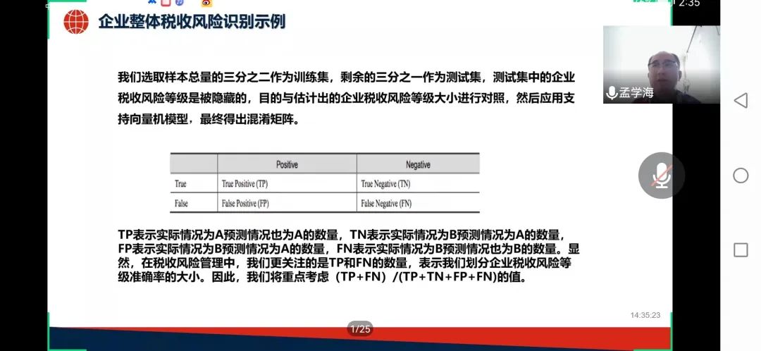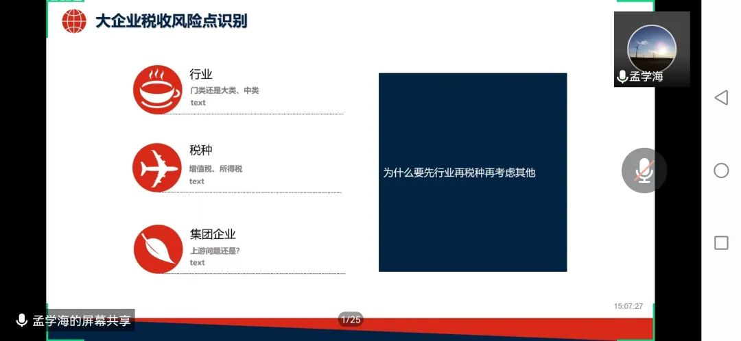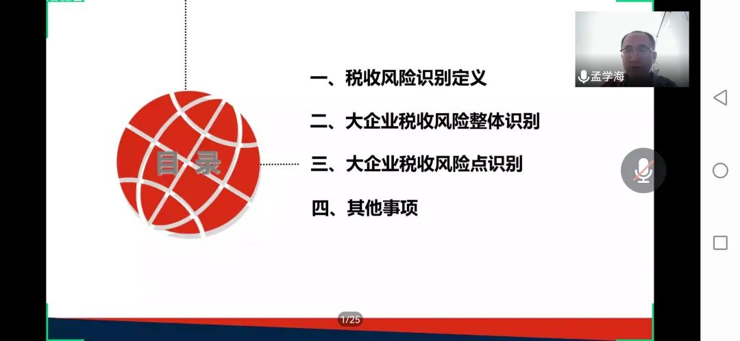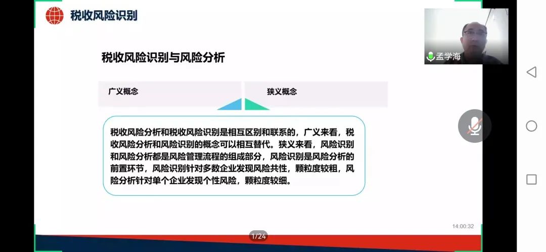本次课程孟学海老师为同学们讲授了“大企业税收风险识别”的相关知识。首先,孟老师从纳税人和税务部门两个视角分析了税收风险的含义,指出本课程侧重于税务部门视角,进而引出了税收风险识别的概念。然后,孟老师讲述了目前税务机关可以利用机器学习识别税收整体风险,通过建立模型、整理数据和分析数据得出结论,并验证大企业税收风险整体识别模型的有效性。随后,孟老师先以澳大利亚风险矩阵为例,又从我国行业、税种和集团企业的角度分析了大企业税收风险点的识别。从面到点,点面结合。最后,孟老师对个人所得税进行了深入解读,并通过两个小例子讲述了个人所得税和大企业税收风险识别的密切联系。