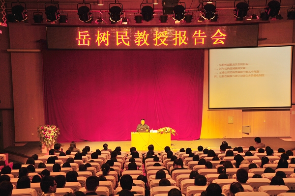 10月8日,中国人民大学财政金融学院副院长兼财政系主任岳树民教授莅临我校并在图书馆报告厅为我院同学作了关于结构性减税的主题讲座,我校科研处处长王怡教授、我院院长张松教授、党委副书记许峰老师、团委书记宋立东老师、团委副书记赵黎光老师以及我院全体同学出席了座谈会。