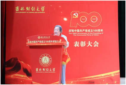 “光荣在党50年”纪念章获得者、党龄67年2个月、90岁高龄的原财政税务系系主任杨慧瑾代表老同志发表感言。她说,在党的百年华诞即将来临之际,获得了“光荣在党50年”纪念章,感到无比荣幸和自豪,这体现了以习近平同志为核心的党中央对老党员的重视、关心和牵挂,也是对我们的鞭策和鼓励,是自己生命航程中一个新的里程碑,将永远铭记、无比珍惜!她深情回顾了自己在党的培养和教育下的从教经历,勉励青年党员要挑起重担,发挥共产党员的先锋模范作用,不负韶华,建功立业,为中华民族的伟大复兴做出更大的贡献。