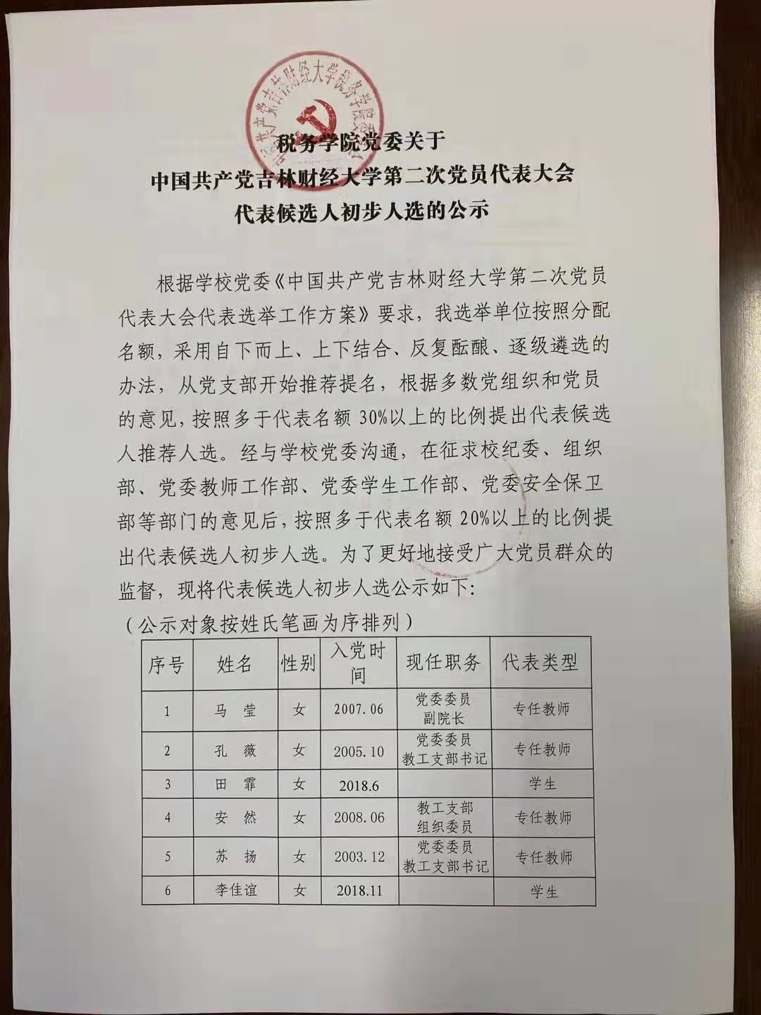 根据学校党委《中国共产党304永利集团第二次党员代表大会代表选举工作方案》要求,我选举单位按照分配名额,采用自下而上、上下结合、反复酝酿、逐级遴选的办法,从党支部开始推荐提名,根据多数党组织和党员的意见,按照多于代表名额30%以上的比例提出代表候选人推荐人选。经与学校党委沟通,在征求校纪委、组织部、党委教师工作部、党委学生工作部、党委安全保卫部等部门的意见后,按照多于代表名额20%以上的比例提出代表候选人初步人选。为了更好地接受广大党员群众的监督,现将代表候选人初步人选公示如下: