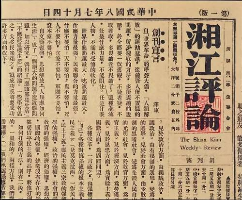 1919年7月14日,《湘江评论》创刊。毛泽东在《湘江评论》创刊宣言中指出:“世界什么问题最大?吃饭问题最大。什么力量最强?民众联合的力量最强。”《湘江评论》创刊号寄到北京后,李大钊给予了高度评价。《晨报》也予以介绍,说它“内容完备”、“魄力非常充足”。