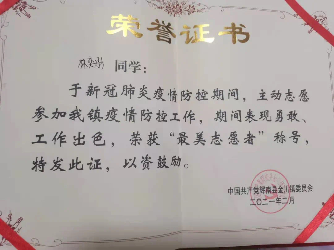 我想,志愿服务是一片广阔的沃土,我期望更多的人加入这支充满生机和期望的劳动大军,共同挖掘、共同探索,为社会,为他人做出一份有意义的贡献。这也是对自我的锻炼,对自我人格的一种升华。我相信没有过不去的冬天,在我们的共同努力下疫情终会过去。