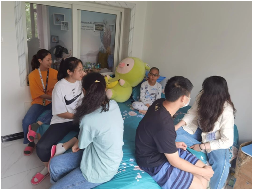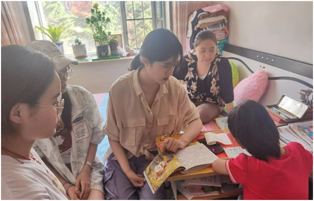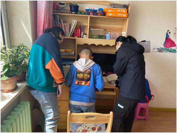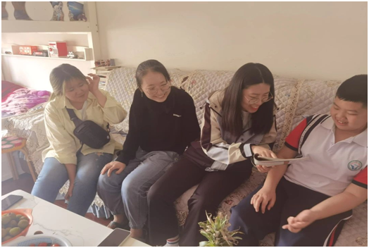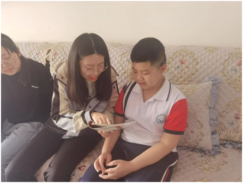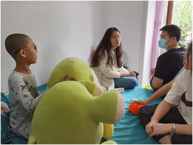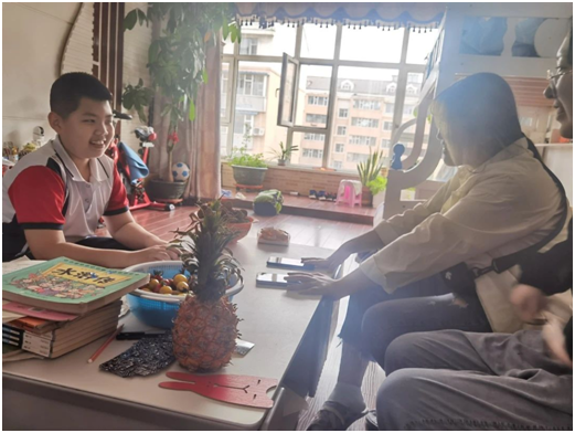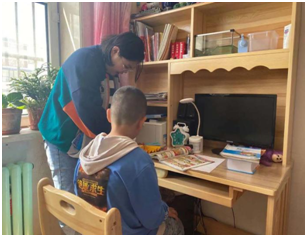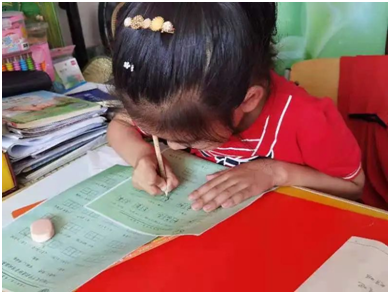 顶着头上的大太阳,我们来到了今天“代理妈妈”活动的目的地,开门的就是我们今天需要帮助的小朋友,看起来活泼又可爱,是个小机灵。拿出书本,拿起铅笔,那是我们这个年纪没有的只属于童年的认真,小姑娘一边写一边流利的读着英文单词,一年级的小朋友已经开始学习当年我们初中才学习的新概念英语,这令我们大吃一惊,她的身上还是存在着爱玩爱动的童真。到了写读书心得的章节,转过身看到的就是满满一书架的书,她说我基本都读完了,她姥姥还给我们分享了她每天读书的视频,真希望她能一直保持这个良好的习惯。结束了作业,我们陪她玩了一会儿,她介绍她的小宠物给我们认识,我发现她的脸上总是洋溢着幸福的笑容,不掺杂任何烦恼。过了一会儿,我们也该回学校了,结束了这短暂的陪伴之旅。