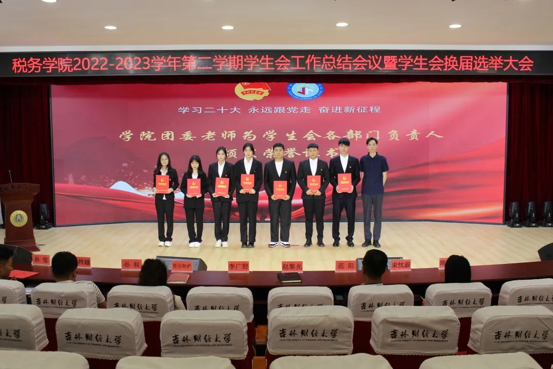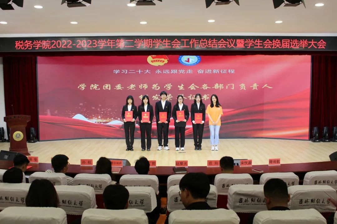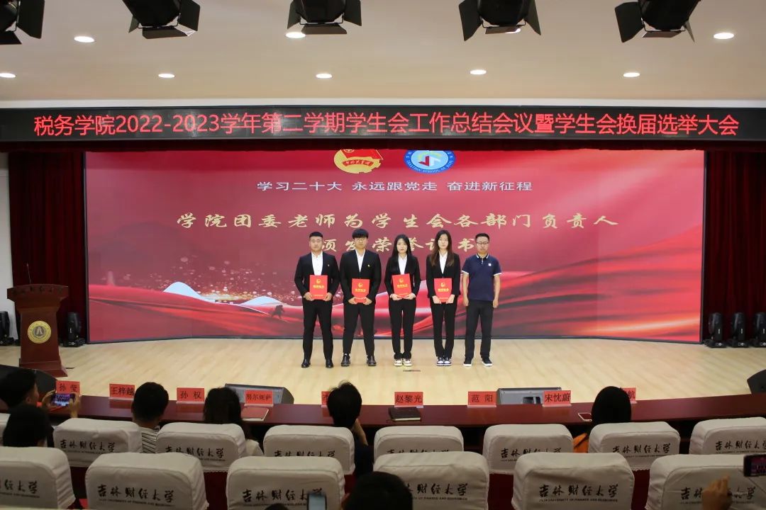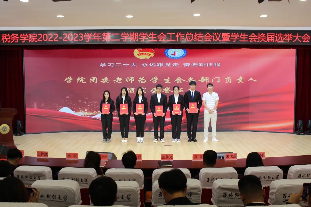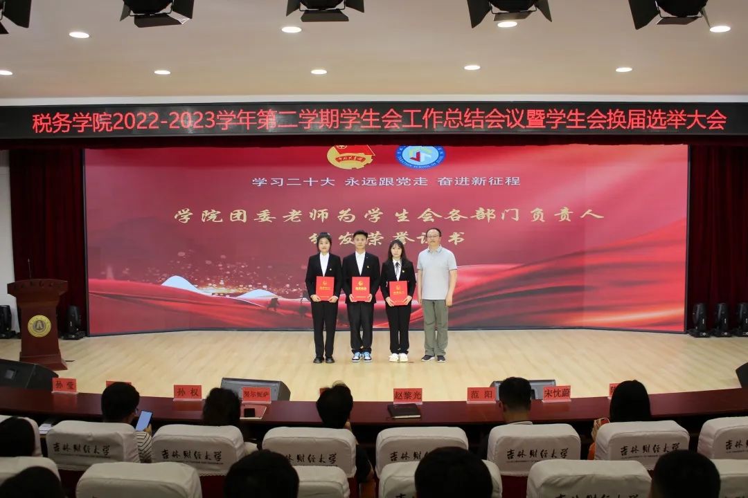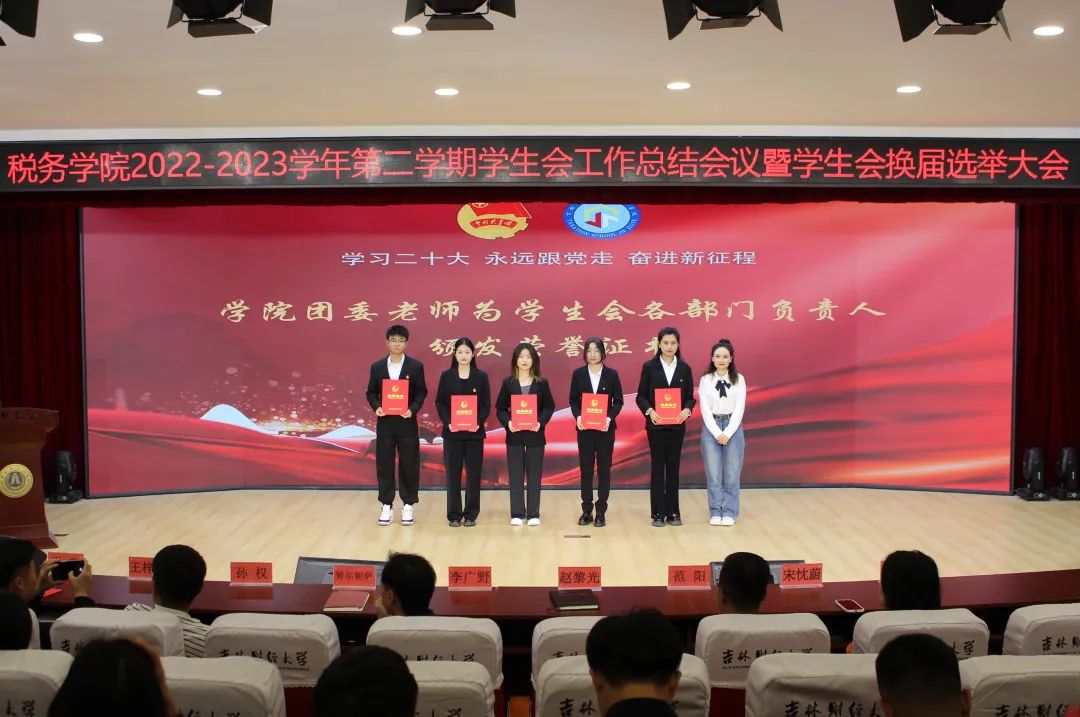 会议第四项,学院团委各位老师为学生会主席团成员及各部门负责人颁发荣誉证书,对大家工作给予肯定的同时感谢所有人在过去一年里为学校、学院的辛勤付出。